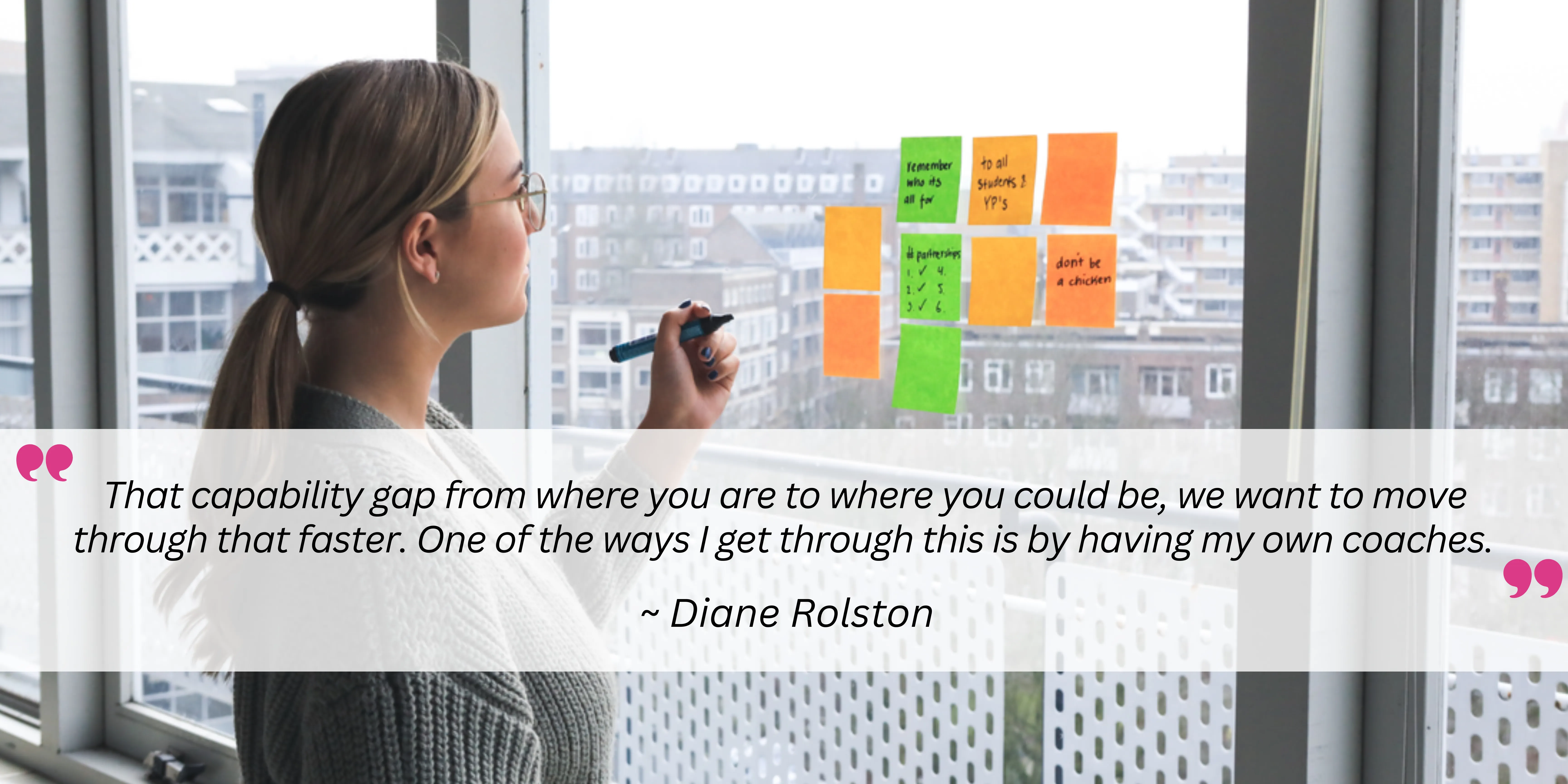 That capability gap from where you are to where you could be, we want to move through that faster. One of the ways I get through this is by having my own coaches. Now it could be sports coaches because I still play soccer. It could be physical in another way like my Pilates instructor. It can also be in a business coach, a life coach, a consultant, or an advisor, whatever it may be, and having someone believe in you.