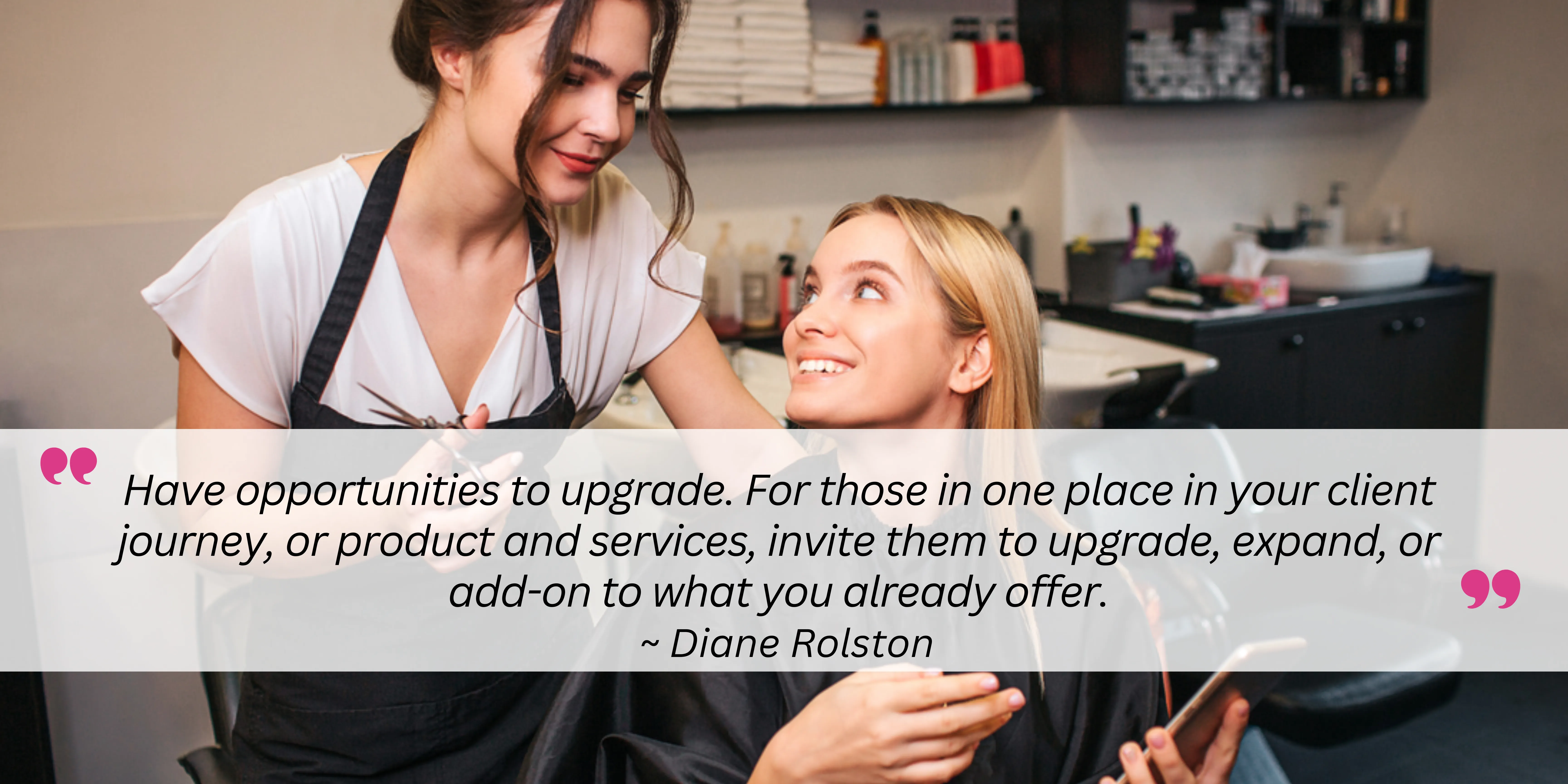 - Have opportunities to upgrade. For those in one place in your client journey, or product and services, invite them to upgrade, expand, or add-on to what you already offer. Not because we're looking to get the most money out of our clients, but we're looking to offer them the best experience and the best results.