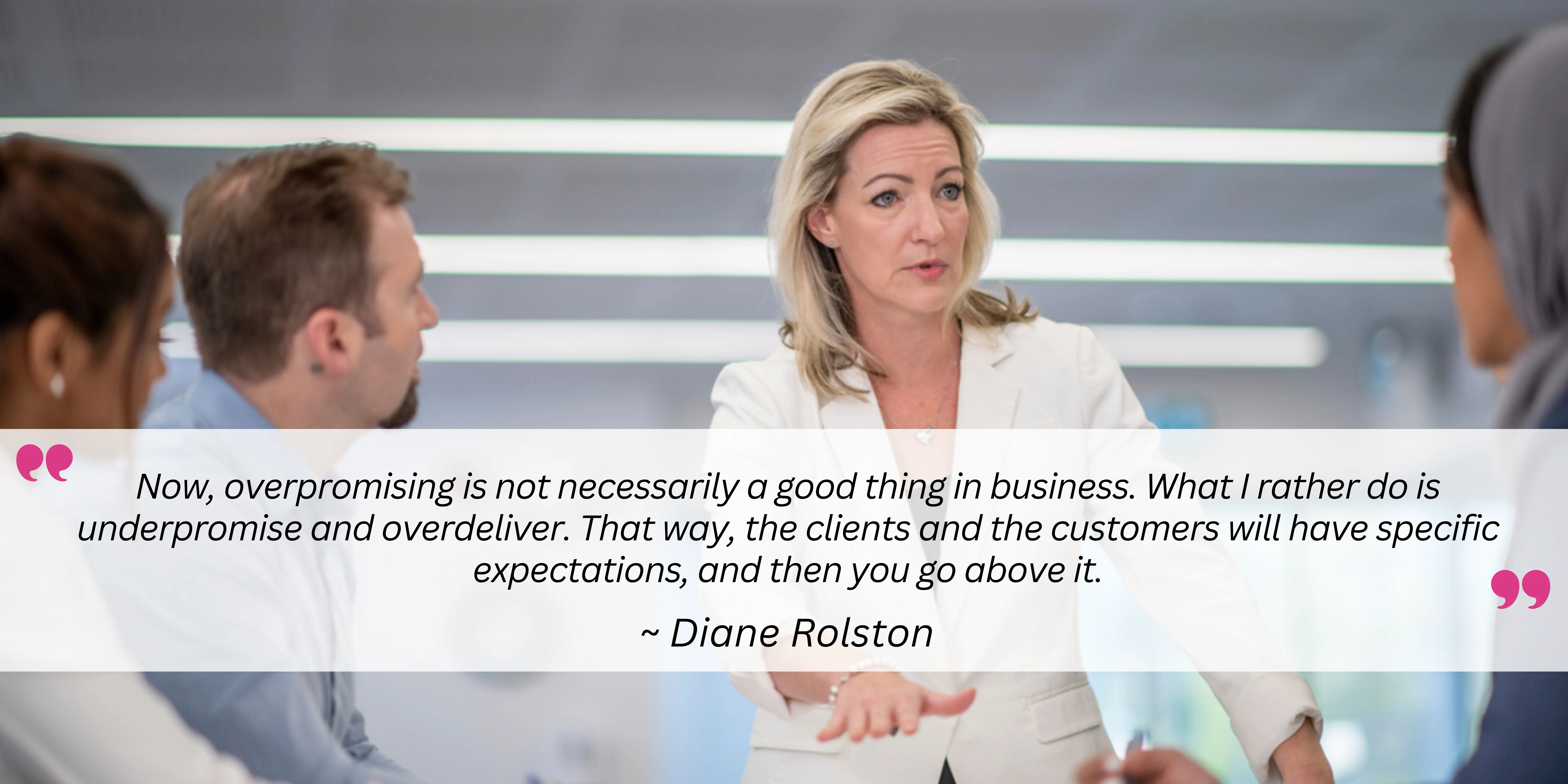 Now, overpromising is not necessarily a good thing in business. What I rather do is underpromise and overdeliver. That way, the clients and the customers will have specific expectations, and then you go above it. If you have a really high promise and you're not truthful about it, you're definitely not going to be able to honor your client or customers' expectations.
