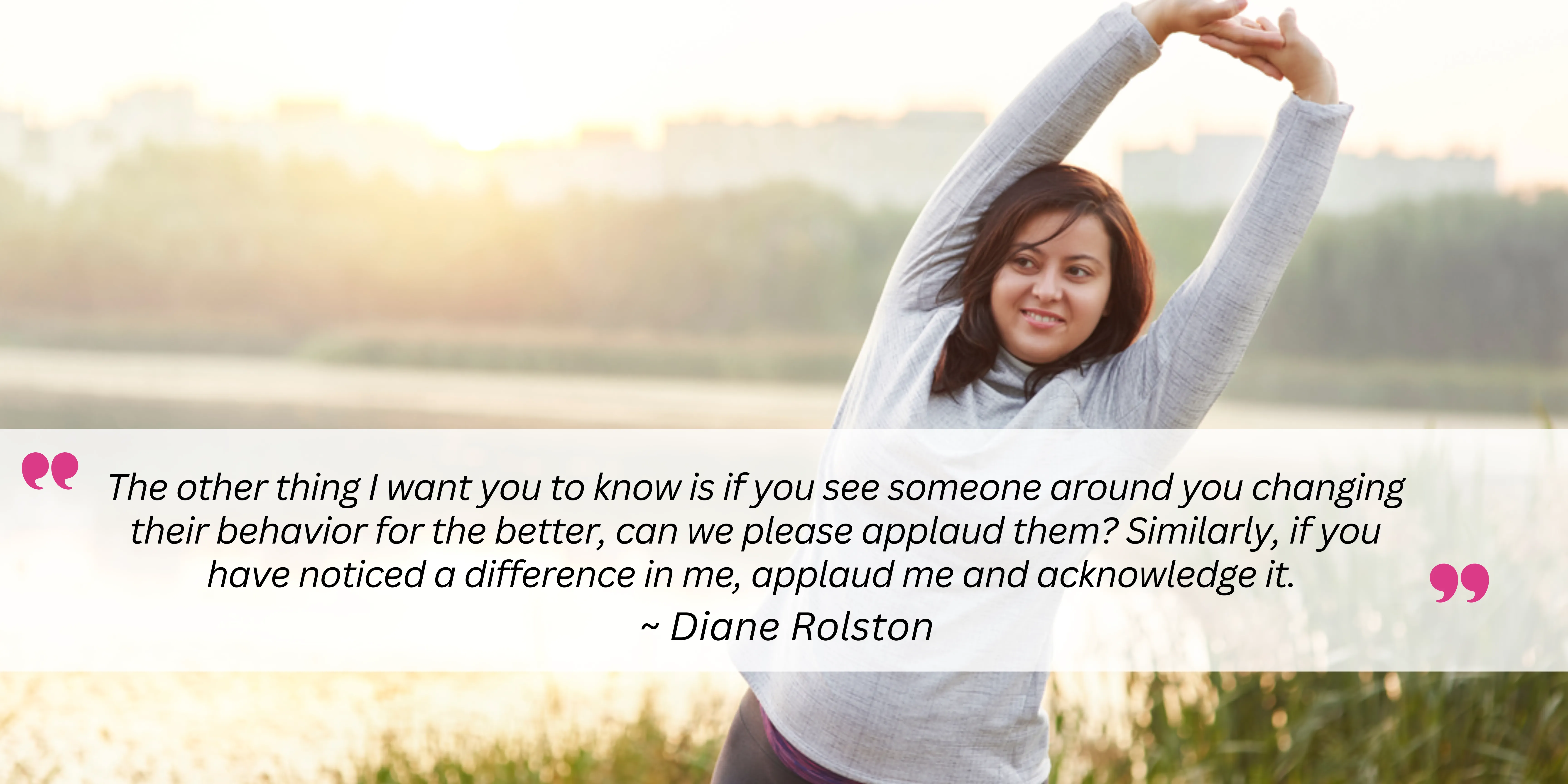 The other thing I want you to know is if you see someone around you changing their behavior for the better, can we please applaud them? Similarly, if you have noticed a difference in me, applaud me and acknowledge it. I have had people at soccer acknowledge me because they know. People at my church, my neighbors, my friends and even acquaintances. It is encouraging, and it is motivating because I look at myself sometimes, and think, “I'm still not where I want to be”. Having that external acknowledgment and feedback is so encouraging.
