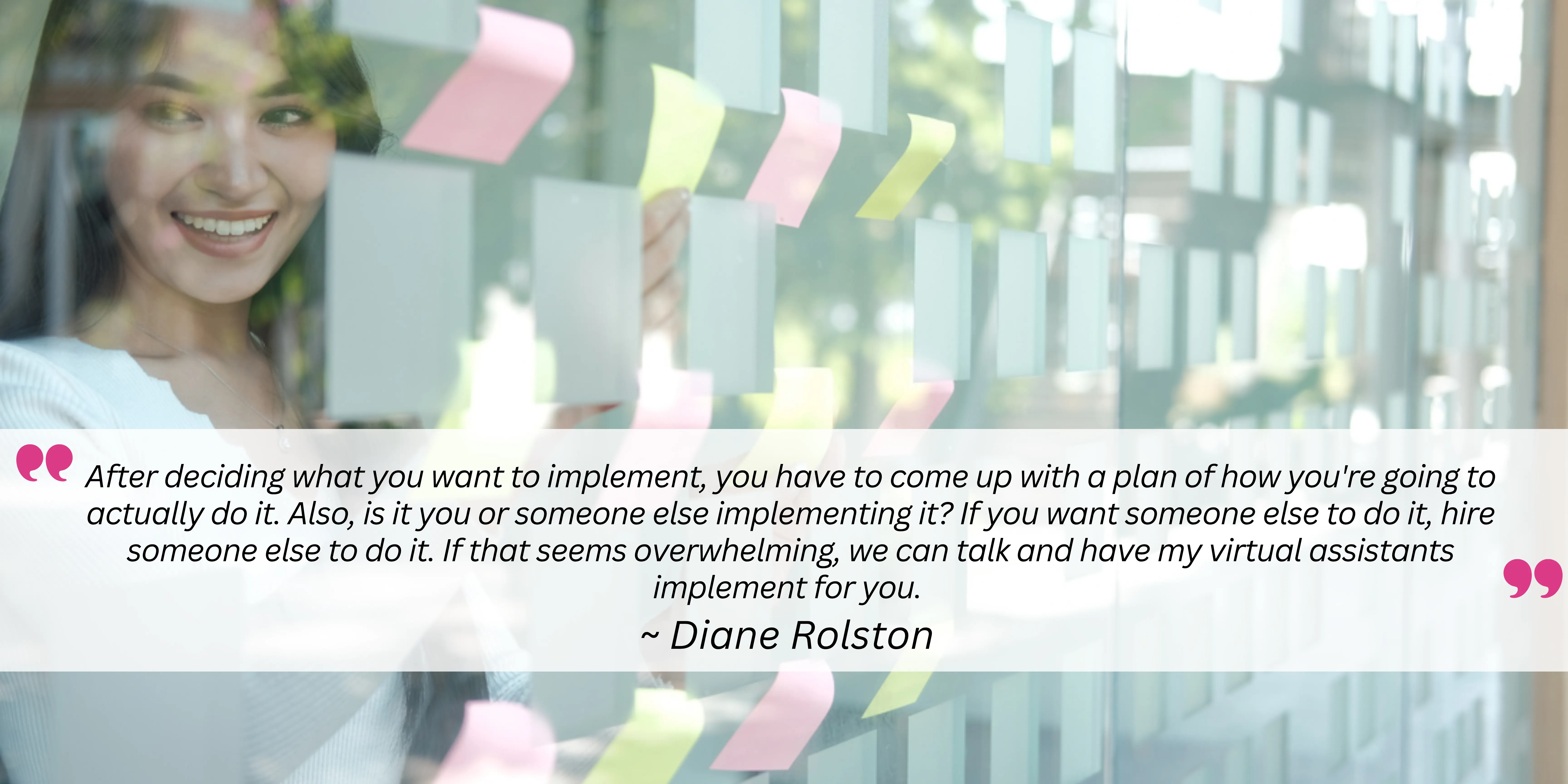 After deciding what you want to implement, you have to come up with a plan of how you're going to actually do it. Also, is it you or someone else implementing it? If you want someone else to do it, hire someone else to do it. If that seems overwhelming, we can talk and have my virtual assistants implement for you.