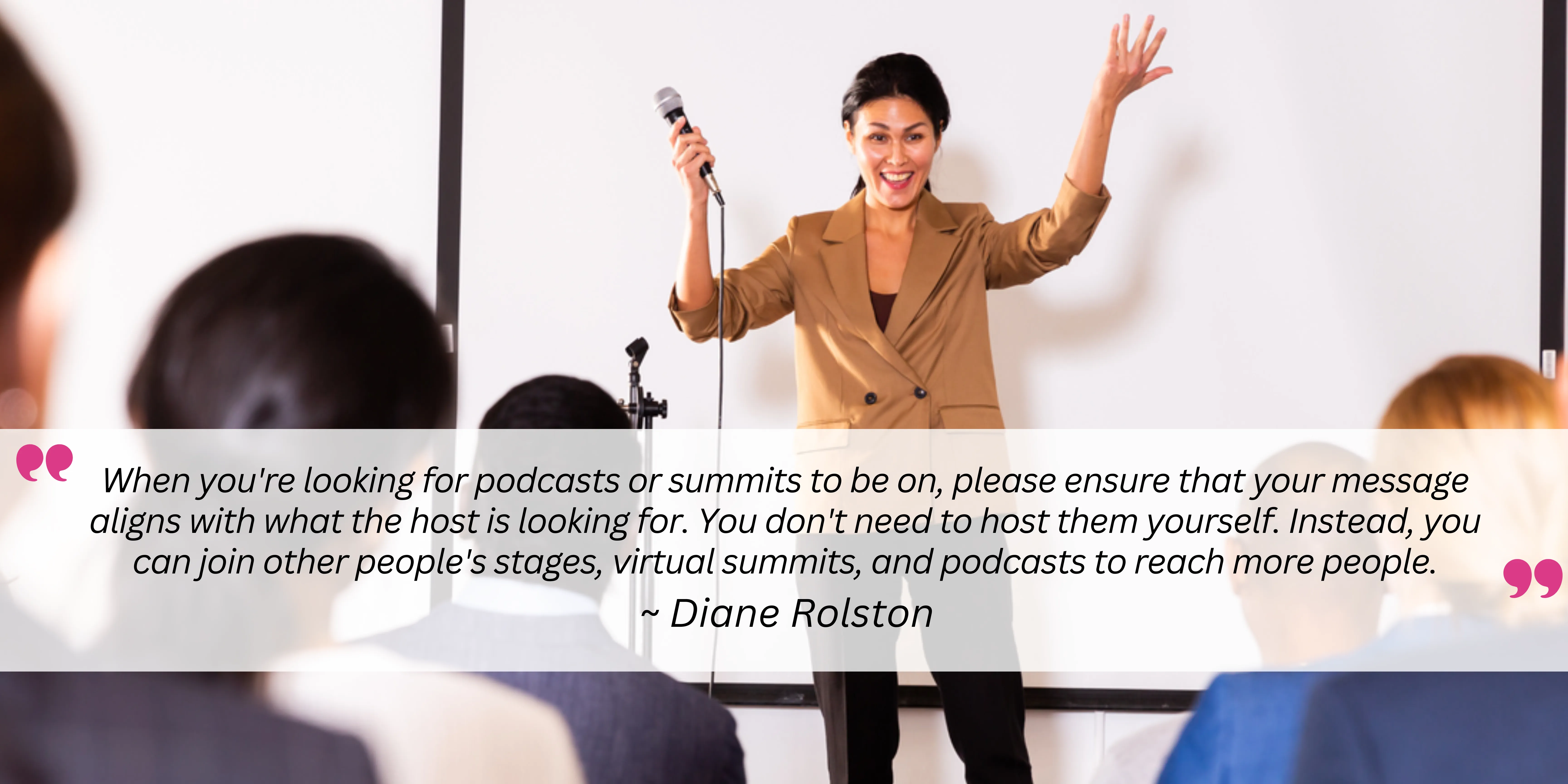 If you don't have a team or all of that support, here's your solution: find summits, podcasts, and other opportunities that other people are organizing. The key thing is to ensure alignment. For example, in my last summit, the “Dynamic Women Online Summit 2023,” I sought female speakers who wanted to address mainly female business owners. When you're looking for podcasts or summits to be on, please ensure that your message aligns with what the host is looking for. You don't need to host them yourself. Instead, you can join other people's stages, virtual summits, and podcasts to reach more people.