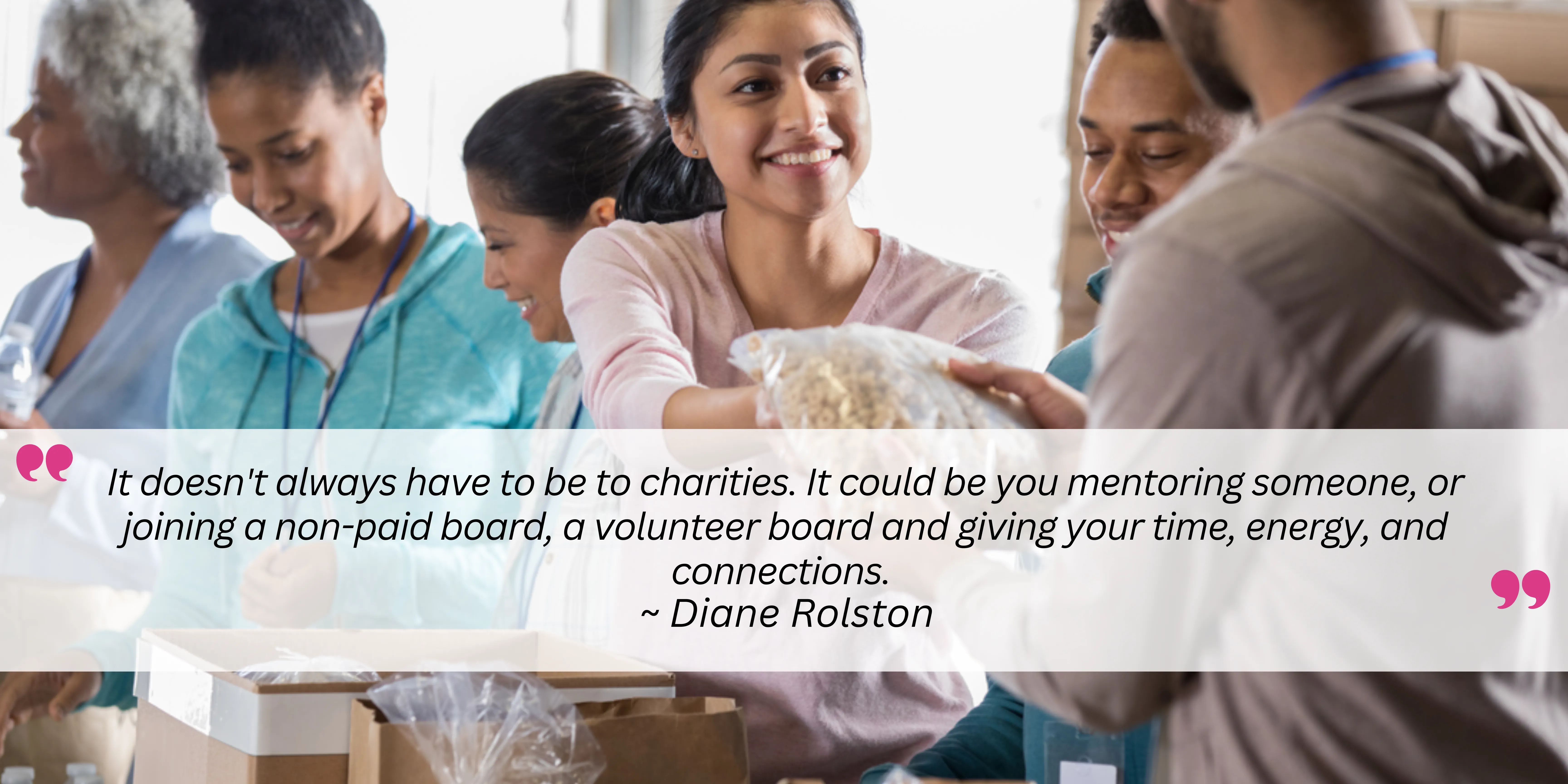 It doesn't always have to be to charities. It could be you mentoring someone, or joining a non-paid board, a volunteer board and giving your time, energy, and connections.
