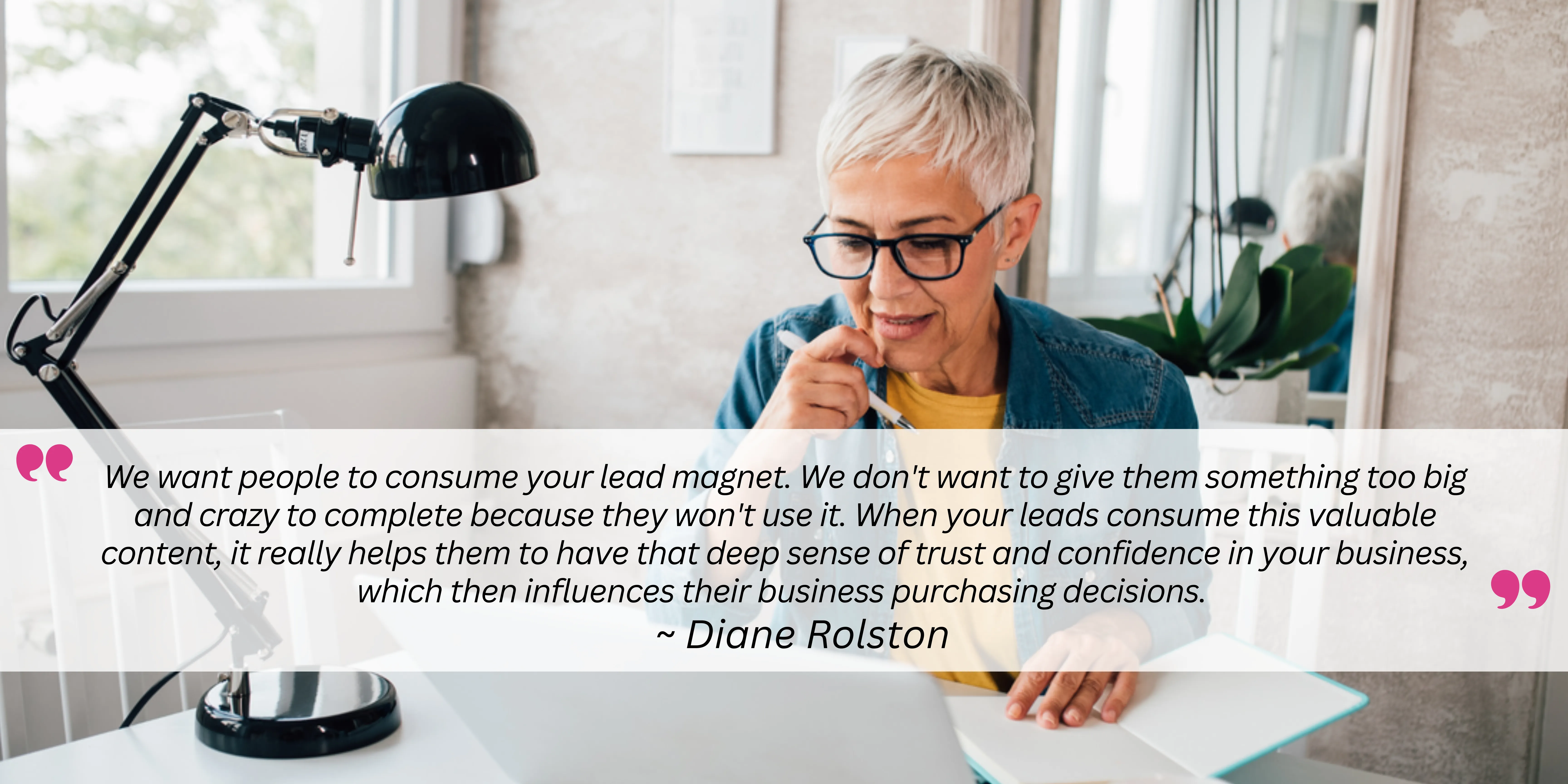 We want people to consume your lead magnet. We don't want to give them something too big and crazy to complete because they won't use it. When your leads consume this valuable content, it really helps them to have that deep sense of trust and confidence in your business, which then influences their business purchasing decisions.